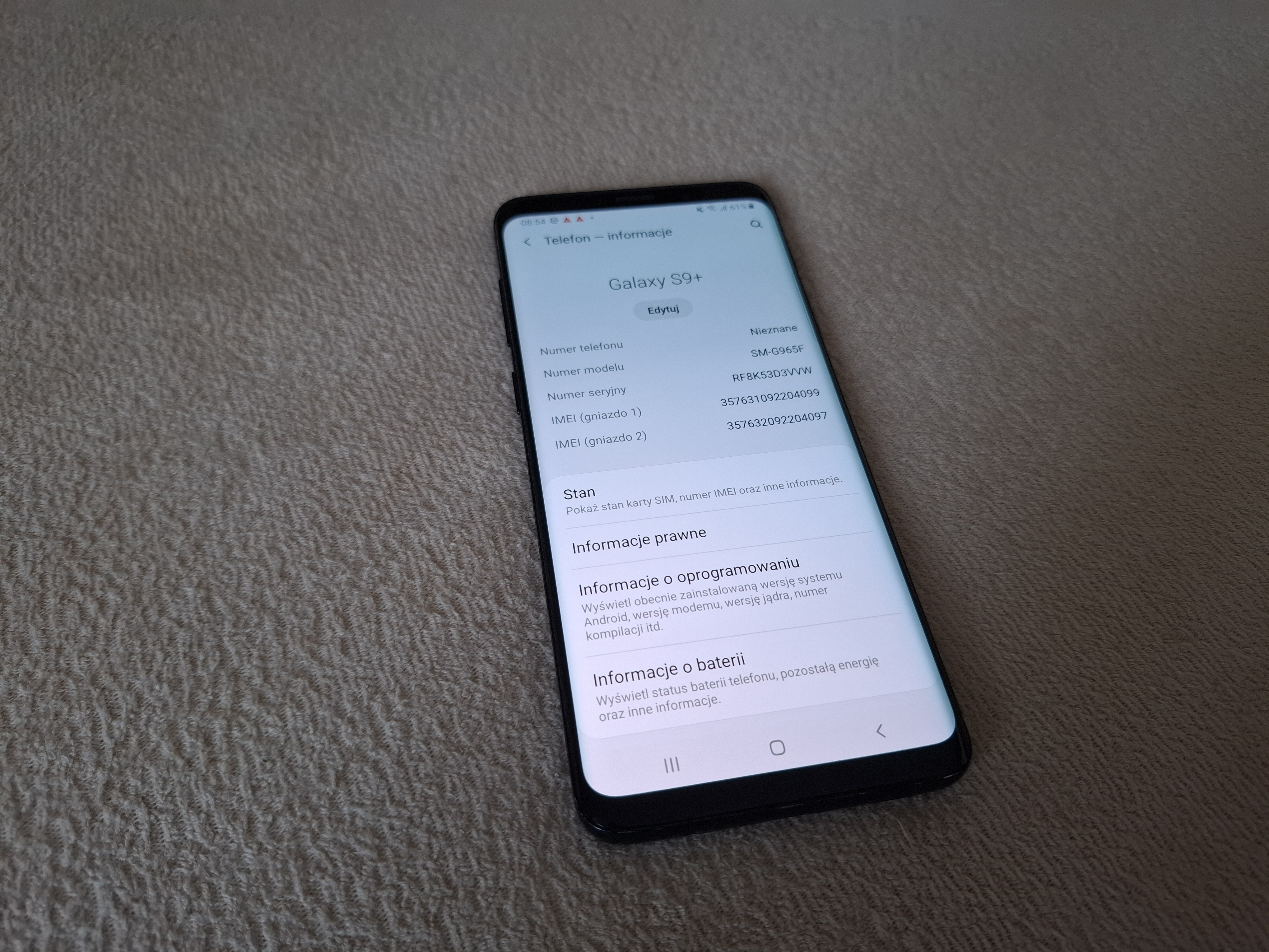 Sprzęt posiada 8 rdzieniowy procesor Samsung Exynos 9810. 4 gb pamięci RAM. 64 gb pamięci wewnętrznej. Ekran 5.8", 2960 x 1440px, Super AMOLED. Bateria 3000 mAh. System nawigacyjny: A-GPS, Galileo, GLONASS, GPS. USB typ C.