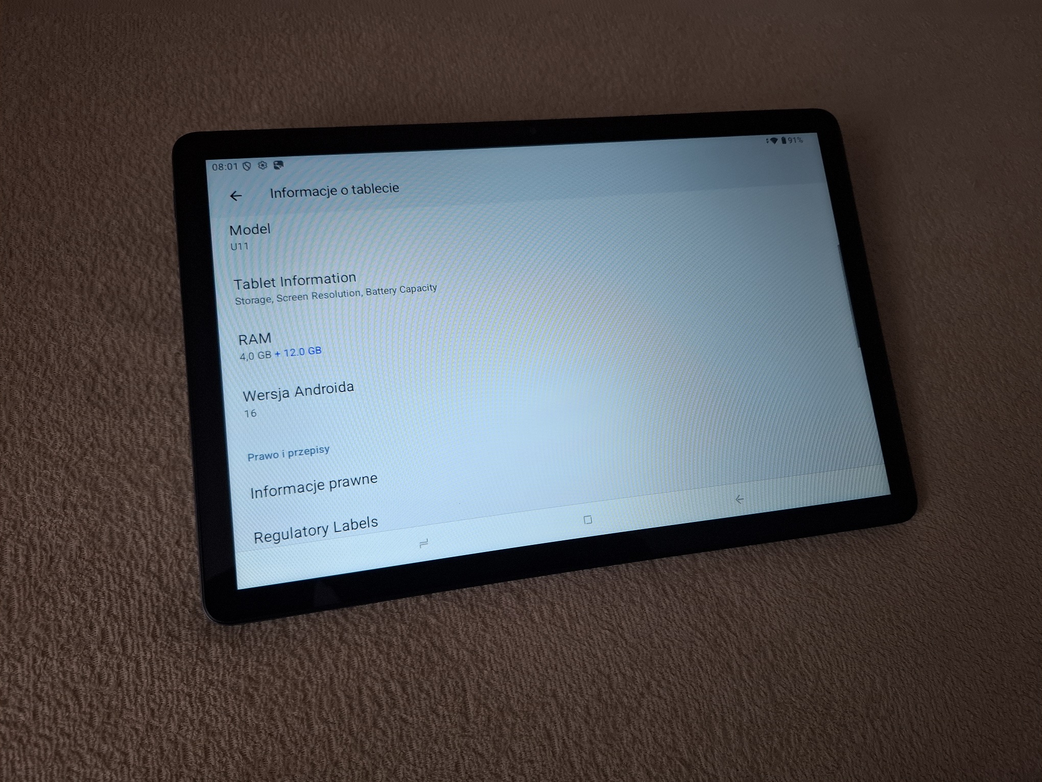 Sprzęt posiada Spreadtrum T606, 8-rdzeniowy. 8GB + do 8GB rozszerzonej pamięci RAM. 128 gb pamięci wewnętrznej. Ekran 11". Android 16. Bateria 8580 mAh. Wejście na sim