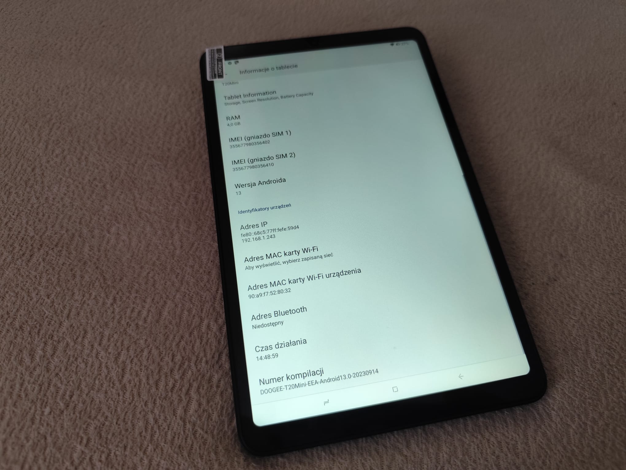 Sprzęt posiada Spreadtrum T606, 8-rdzeniowy. 4GB + do 5GB rozszerzonej pamięci RAM. 128 gb pamięci wewnętrznej. Ekran 8.4", 1920 x 1200px, IPS. Android 13. Bateria 5060 mAh. Wejście na sim. Autoobrót, Certyfikat TÜV SÜD Blue Light, Dotykowy, Podział ekranu.